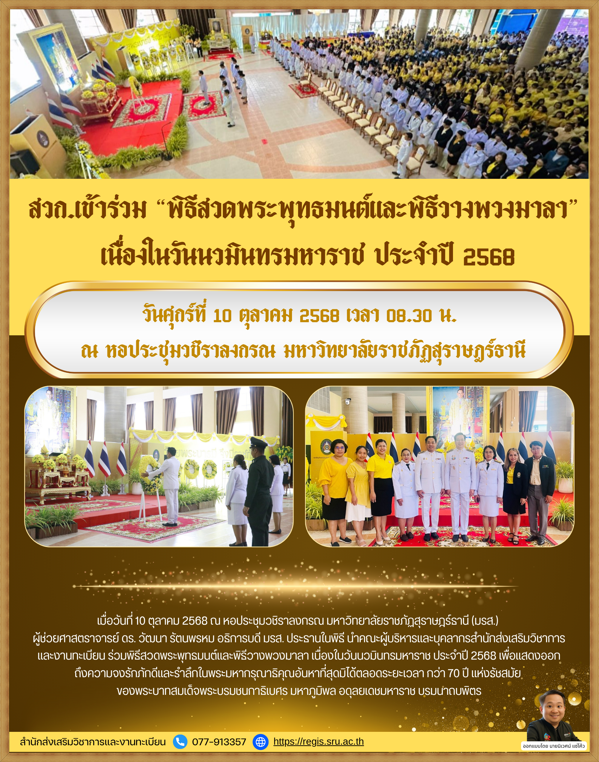 เมื่อวันที่ 10 ตุลาคม 2568 ณ หอประชุมวชิราลงกรณ มหาวิทยาลัยราชภัฏสุราษฎร์ธานี (มรส.) ผู้ช่วยศาสตราจารย์ ดร. วัฒนา รัตนพรหม อธิการบดี มรส. ประธานในพิธี…