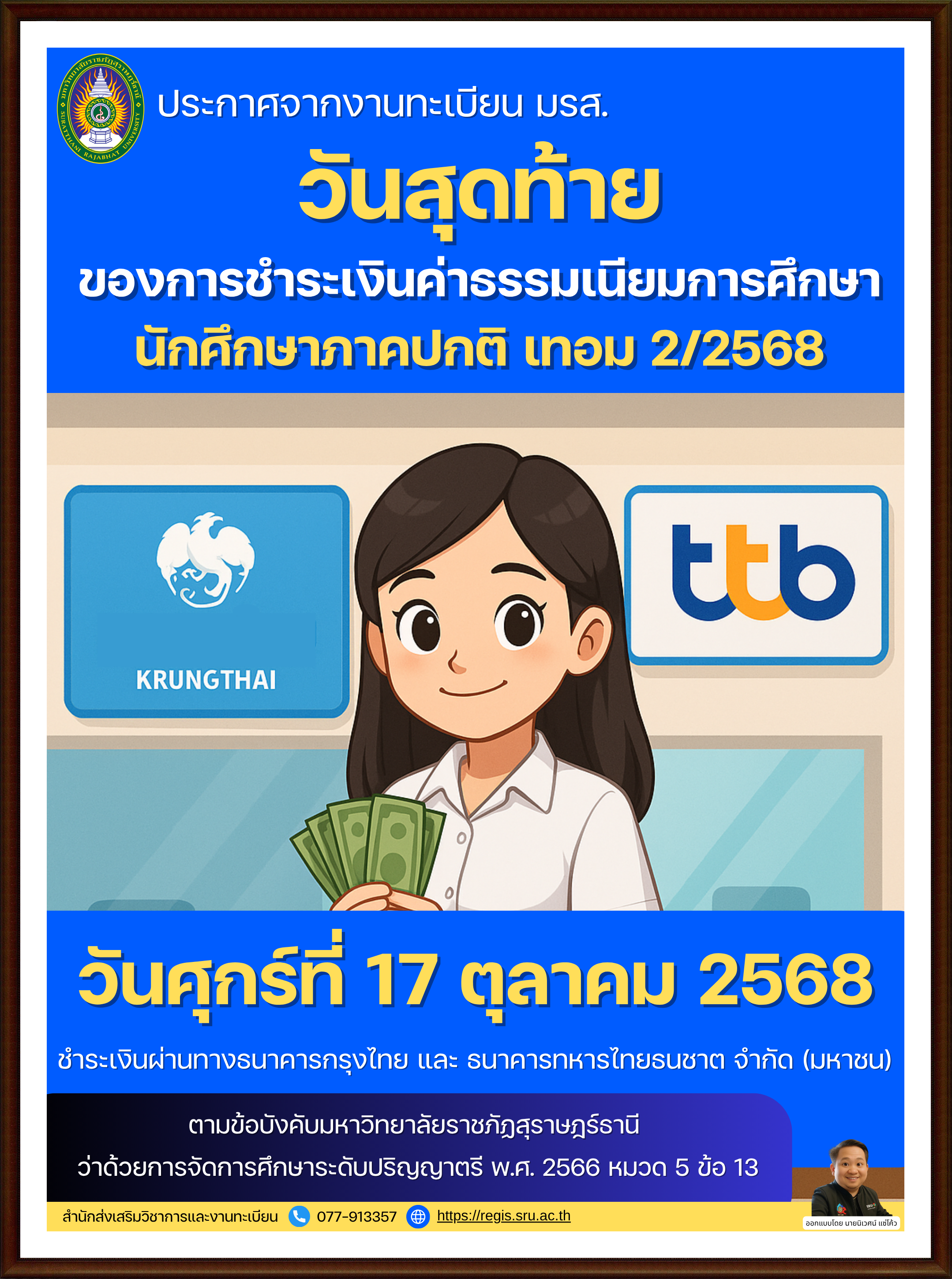ประกาศมหาวิทยาลัยราชภัฏสุราษฎร์ธานี ค่าธรรมเนียมการศึกษาประจำภาคเรียน สำหรับนักศึกษาภาคปกติ ระดับปริญญาตรี พ.ศ. 2569 คลิกดูประกาศ