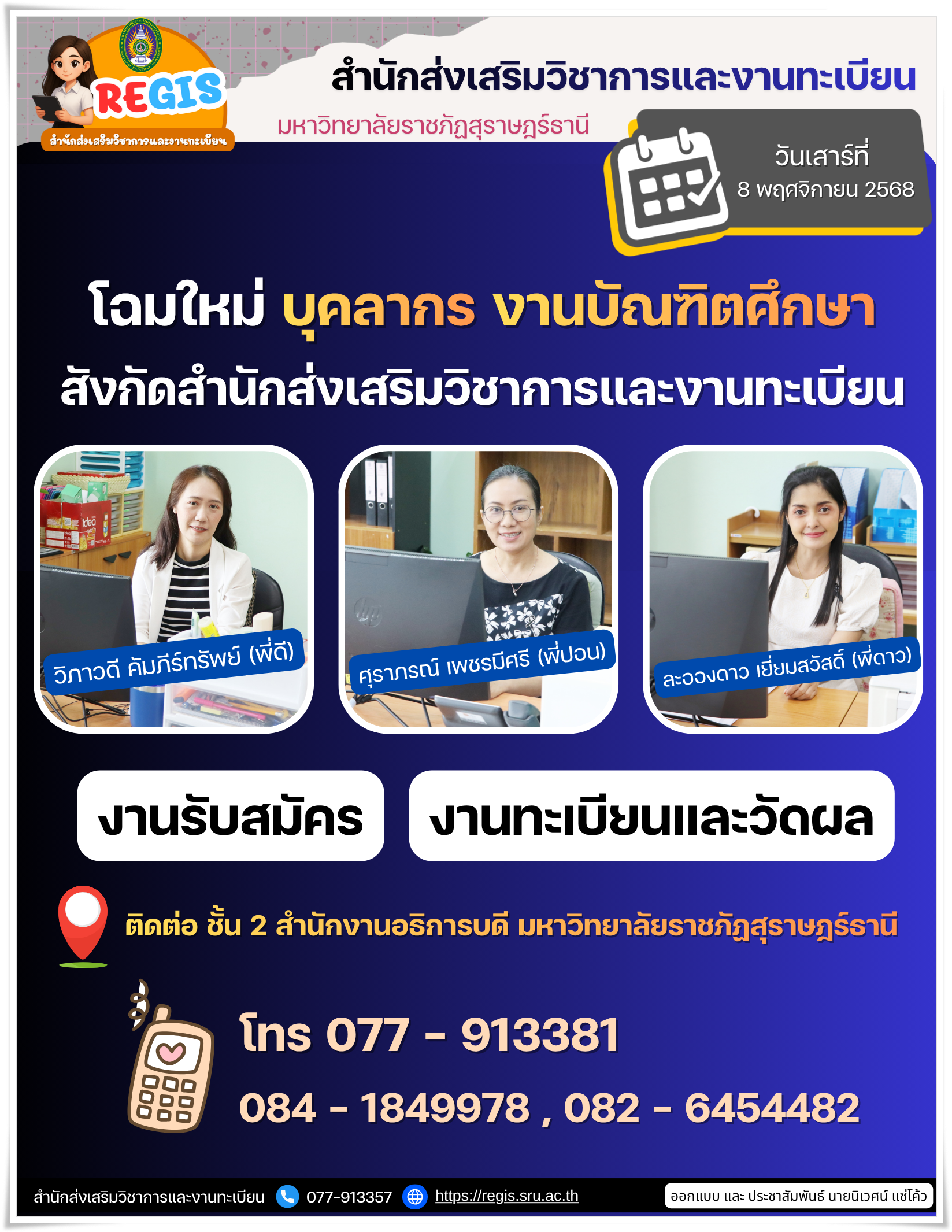 REGIS NEWS ประกาศด่วน! จากงานทะเบียน มรส. สำหรับนักศึกษาภาคปกติ ทุกชั้นปี ที่ยังไม่ลงทะเบียนเรียน ผ่านระบบบริการการศึกษา https://reg.sru.ac.th/ ให้รีบดำเนินการให้เสร็จสิ้นภายใน วันศุกร์ที่ 8 ธ.ค. 2566 เท่านั้น หากนักศึกษาไม่ดำเนินการลงทะเบียนเรียน ภายในวันที่กำหนด จะต้องเขียนคำร้องขอรักษาสภาพการเป็นนักศึกษา ประจำภาคเรียนที่ 2/2566