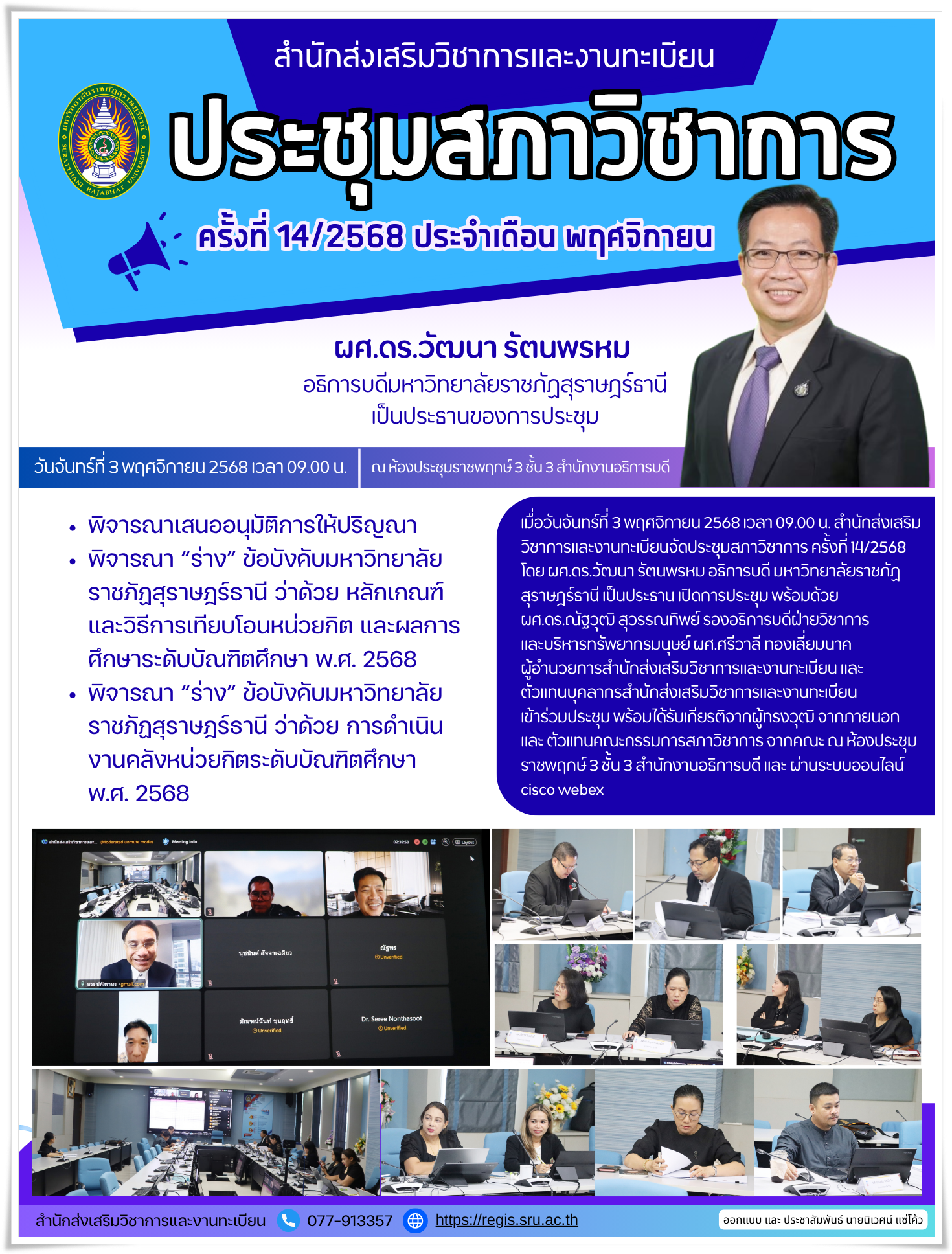 เมื่อวันจันทร์ที่ 3 พฤศจิกายน 2568 เวลา 09.00 น. สำนักส่งเสริมวิชาการและงานทะเบียนจัดประชุมสภาวิชาการ ครั้งที่ 14/2568 พิจารณาเสนออนุมัติการให้ปริญณา พิจารณา “ร่าง” ข้อบังคับมหาวิทยาลัยราชภัฏสุราษฎร์ธานี ว่าด้วย…
