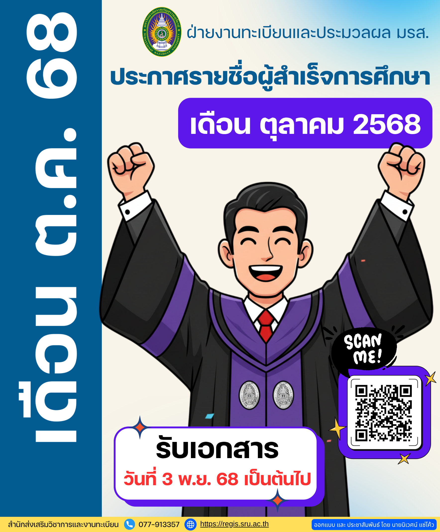 ที่สำนักส่งเสริมวิชาการและงานทะเบียน ชั้น 1 สำนักงานอธิการบดี วันและเวลาราชการ แต่งกายชุดสุภาพเรียบร้อย คลิกเพื่อตรวจสอบรายชื่อผู้สำเร็จการศึกษา รอบเดือน ตุลาคม 2568