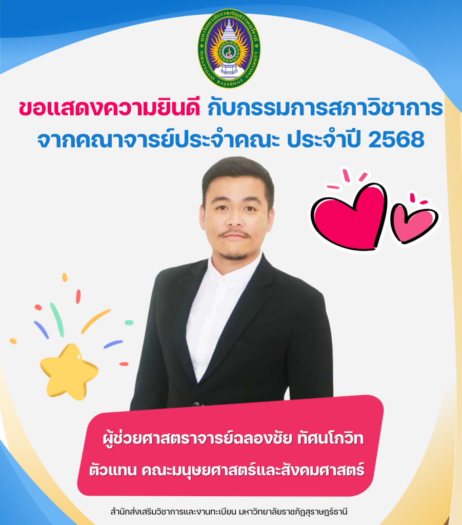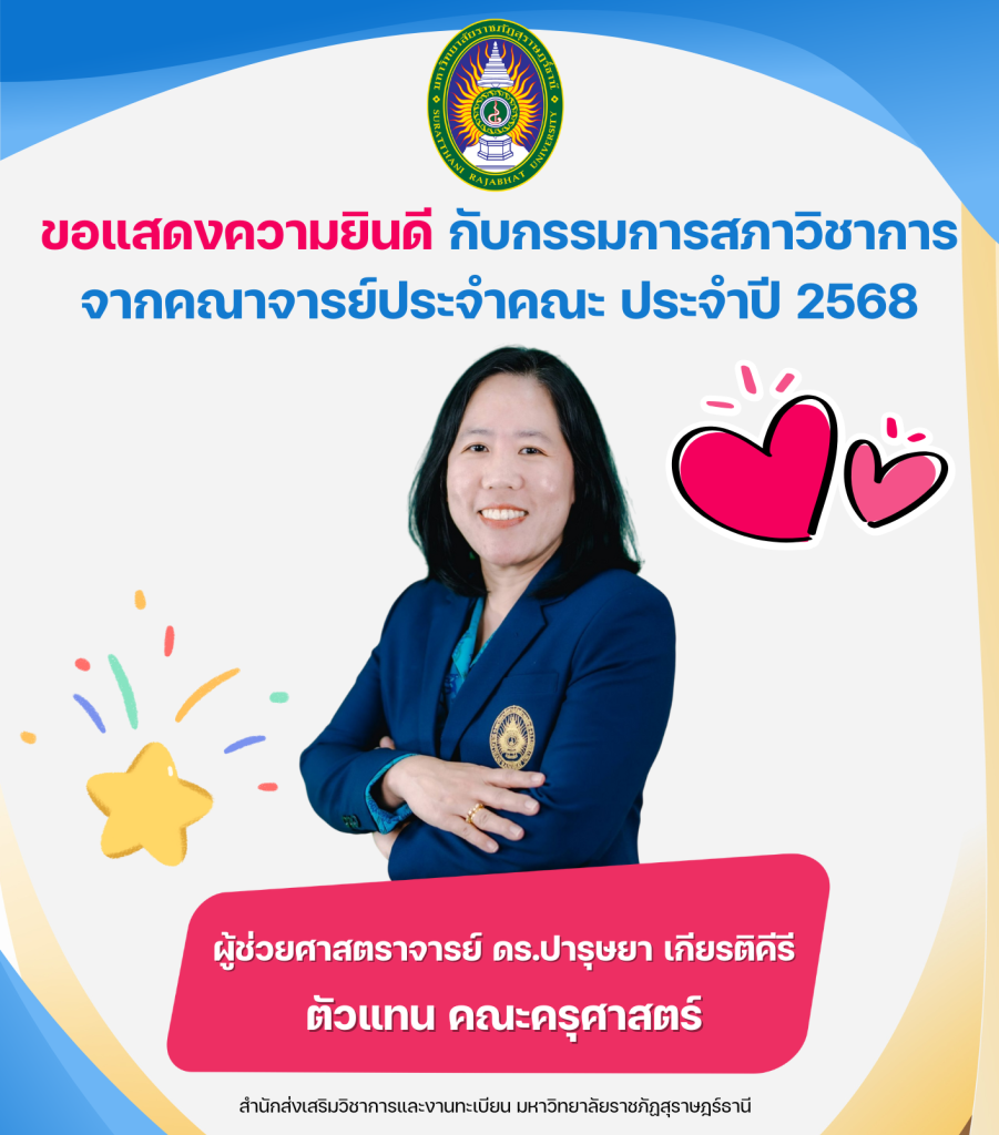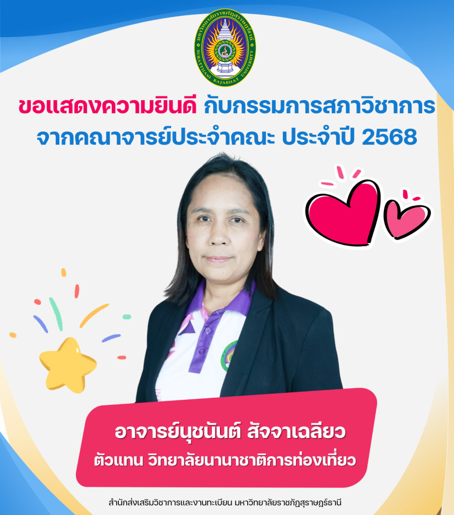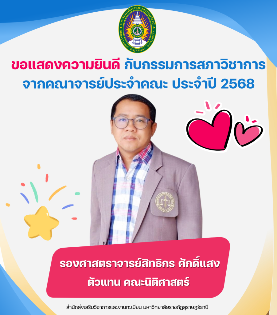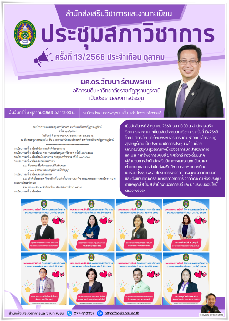 เมื่อวันจันทร์ที่ 6 ตุลาคม 2568 เวลา 13.30 น. สำนักส่งเสริมวิชาการและงานทะเบียนจัดประชุมสภาวิชาการ ครั้งที่ 13/2568 โดย ผศ.ดร.วัฒนา รัตนพรหม อธิการบดี มหาวิทยาลัยราชภัฏสุราษฎร์ธานี เป็นประธาน เปิดการประชุม พร้อมด้วย ผศ.ดร.ณัฐวุฒิ สุวรรณทิพย์ รองอธิการบดีฝ่ายวิชาการและบริหารทรัพยากรมนุษย์ ผศ.ศรีวาลี ทองเลี่ยมนาคผู้อำนวยการสำนักส่งเสริมวิชาการและงานทะเบียน และตัวแทนบุคลากรสำนักส่งเสริมวิชาการและงานทะเบียน เข้าร่วมประชุม พร้อมได้รับเกียรติจากผู้ทรงวุฒิ จากภายนอกและ ตัวแทนคณะกรรมการสภาวิชาการ จากคณะ ณ ห้องประชุมราชพฤกษ์ 3 ชั้น 3 สำนักงานอธิการบดี และ ผ่านระบบออนไลน์ cisco webex