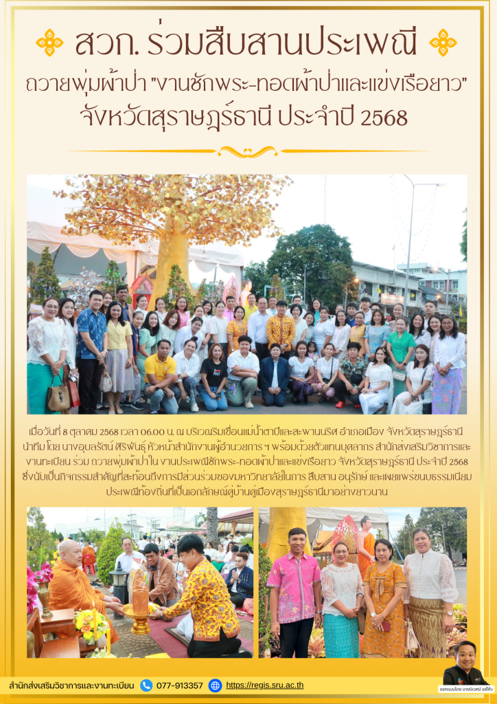 REGIS NEWS สวก. ร่วมสืบสานประเพณี ถวายพุ่มผ้าป่า “งานชักพระ-ทอดผ้าป่าและแข่งเรือยาว” จังหวัดสุราษฎร์ธานี ประจำปี 2568