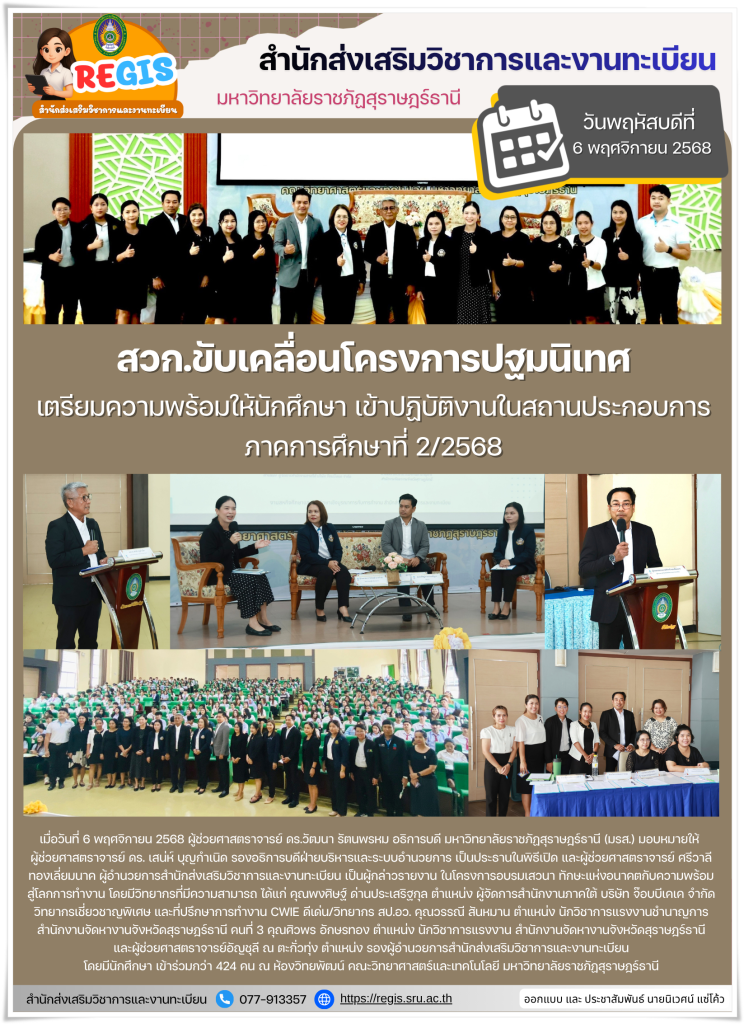 REGIS NEWS สวก.ขับเคลื่อนโครงการปฐมนิเทศ เตรียมความพร้อมให้นักศึกษา เข้าปฏิบัติงานในสถานประกอบการ ภาคการศึกษาที่ 2/2568