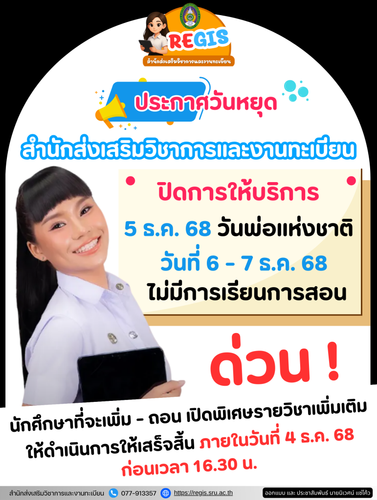 REGIS NEWS ประกาศวันหยุด สำนักส่งเสริมวิชาการและงานทะเบียน ปิดการให้บริการ 5 ธ.ค. 68 วันพ่อแห่งชาติ วันที่ 6 – 7 ธ.ค. 68 ไม่มีการเรียนการสอน