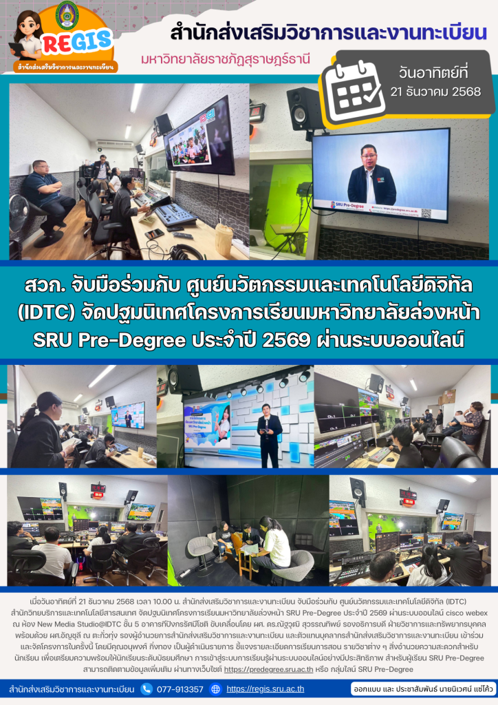 เมื่อวันอาทิตย์ที่ 21 ธันวาคม 2568 เวลา 10.00 น. สำนักส่งเสริมวิชาการและงานทะเบียน จับมือร่วมกับ ศูนย์นวัตกรรมและเทคโนโลยีดิจิทัล (IDTC) สำนักวิทยบริการและเทคโนโลยีสารสนเทศ จัดปฐมนิเทศโครงการเรียนมหาวิทยาลัยล่วงหน้า SRU Pre-Degree ประจำปี 2569 ผ่านระบบออนไลน์ cisco webex ณ ห้อง New Media Studio@IDTC ชั้น 5 อาคารทีปังกรรัศมีโชติ ขับเคลื่อนโดย ผศ. ดร.ณัฐวุฒิ สุวรรณทิพย์ รองอธิการบดี ฝ่ายวิชาการและทรัพยากรบุคคล พร้อมด้วย ผศ.อัญชุลี ณ ตะกั่วทุ่ง รองผู้อำนวยการสำนักส่งเสริมวิชาการและงานทะเบียน และตัวแทนบุคลากรสำนักส่งเสริมวิชาการและงานทะเบียน เข้าร่วมและจัดโครงการในครั้งนี้ โดยมีคุณอนุพงศ์ กิ่งทอง เป็นผู้ดำเนินรายการ ชี้แจงรายละเอียดการเรียนการสอน รายวิชาต่าง ๆ สิ่งอำนวยความสะดวกสำหรับนักเรียน เพื่อเตรียมความพร้อมให้นักเรียนระดับมัธยมศึกษา การเข้าสู่ระบบการเรียนรู้ผ่านระบบออนไลน์อย่างมีประสิทธิภาพ สำหรับผู้เรียน SRU Pre-Degree สามารถติดตามข้อมูลเพิ่มเติม ผ่านทางเว็บไซต์ https://predegree.sru.ac.th หรือ กลุ่มไลน์ SRU Pre-Degree