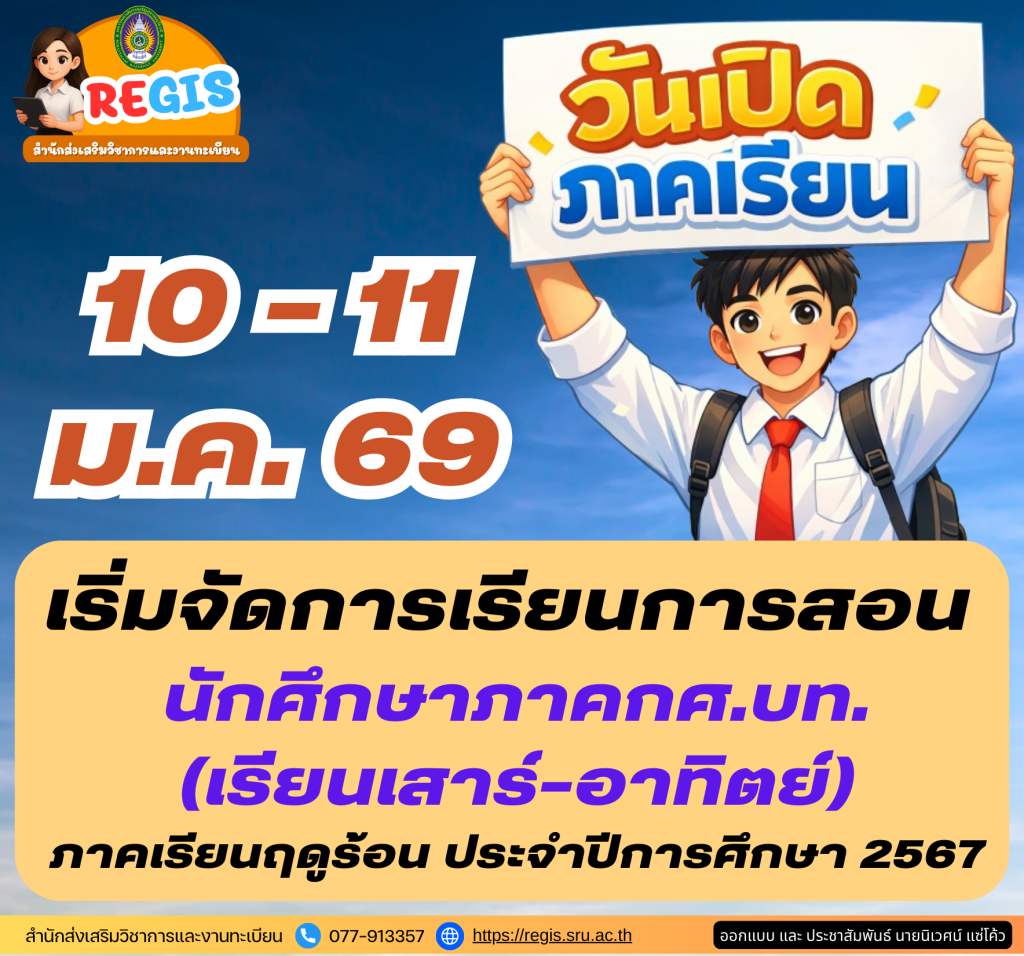 REGIS NEWS วันเปิดภาคเรียน 10-11 มกราคม 2569 เริ่มจัดการเรียนการสอน นักศึกษาภาคกศ.บท.(เรียนเสาร์-อาทิตย์) ภาคเรียนฤดูร้อน ประจำปีการศึกษา 2567