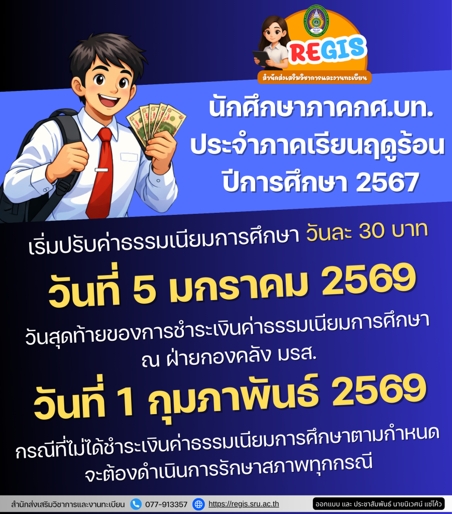 REGIS NEWS นักศึกษาภาคกศ.บท.ประจำภาคเรียนฤดูร้อน ปีการศึกษา 2567 เริ่มปรับค่าธรรมเนียมการศึกษา วันละ 30 บาท วันที่ 5 มกราคม 2569