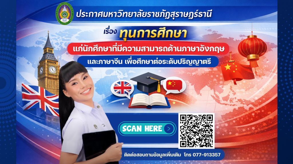 REGIS NEWS ประกาศมหาวิทยาลัยราชภัฏสุราษฎร์ธานี เรื่อง ทุนการศึกษาแก่นักเรียนที่มีความสามารถด้านภาษาอังกฤษและภาษาจีน เพื่อศึกษาต่อระดับปริญญาตรี
