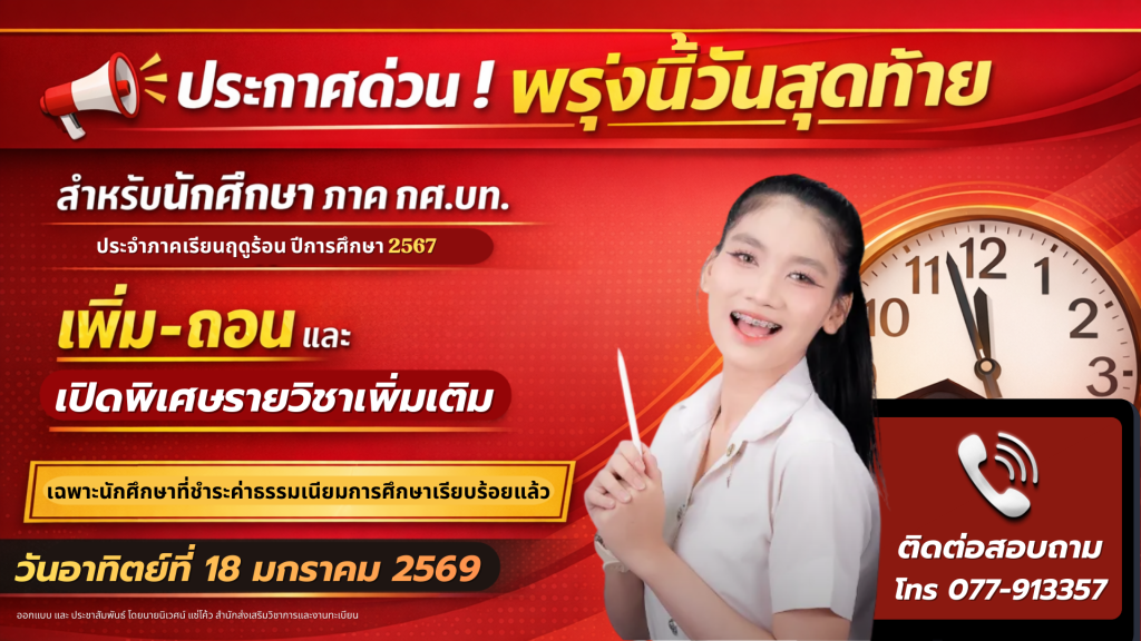 REGIS NEWS ประกาศด่วน! งานทะเบียน มรส. พรุ่งนี้วันสุดท้าย สำหรับนักศึกษา ภาคกศ.บท. ประจำภาคเรียนฤดูร้อน ปีการศึกษา 2567 เพิ่ม-ถอน และเปิดพิเศษรายวิชาเพิ่มเติม เฉพาะนักศึกษาที่ชำระค่าธรรมเนียมการศึกษาเรียบร้อยแล้ว วันอาทิตย์ที่ 18 มกราคม 2569