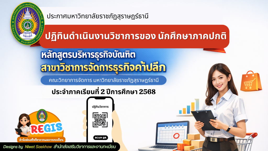 REGIS NEWS ปฏิทินดำเนินงานวิชาการของนักศึกษาภาคปกติ หลักสูตรบริหารธุรกิจบัณฑิต สาขาวิชาการจัดการธุรกิจค้าปลีก คณะวิทยาการจัดการ มหาวิทยาลัยราชภัฏสุราษฎร์ธานี ประจำภาคเรียนที่ 2 ปีการศึกษา 2568