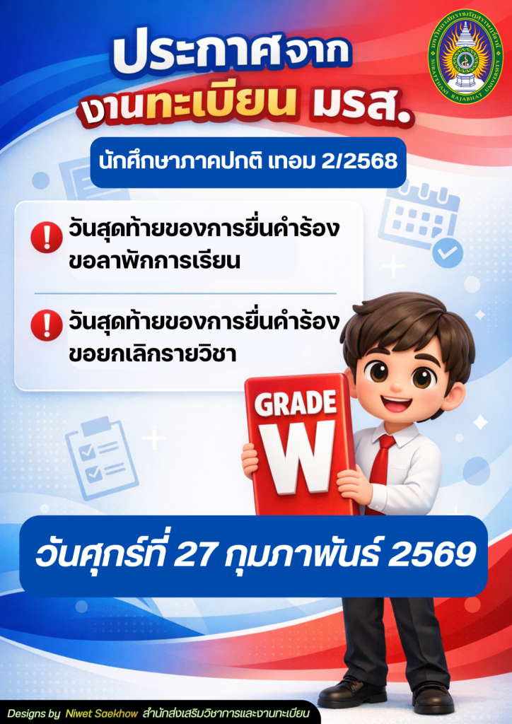 REGIS NEWS ประกาศจาก งานทะเบียน มรส. สำหรับนักศึกษาภาคปกติ เทอม2/2568 วันสุดท้ายของการยื่นคำร้องขอลาพักการเรียน วันสุดท้ายของการยื่นคำร้องขอยกเลิกรายวิชา วันศุกร์ที่ 27 กุมภาพันธ์ 2569