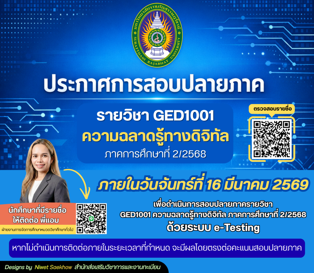REGIS NEWS ประกาศการสอบปลายภาครายวิชา GED1001 ความฉลาดรู้ทางดิจิทัล ภาคการศึกษาที่ 2/2568 นักศึกษาที่มีรายชื่อ ให้ติดต่อ พี่แอม ฝ่ายงานการจัดการศึกษาหมวดวิชาศึกษาทั่วไป ภายในวันจันทร์ที่ 16 มีนาคม 2569 เพื่อดำเนินการสอบปลายภาครายวิชา GED1001 ความฉลาดรู้ทางดิจิทัล ภาคการศึกษาที่ 2/2568 ด้วยระบบ e-Testing หากไม่ดำเนินการติดต่อภายในระยะเวลาที่กำหนด จะมีผลโดยตรงต่อคะแนนสอบปลายภาค