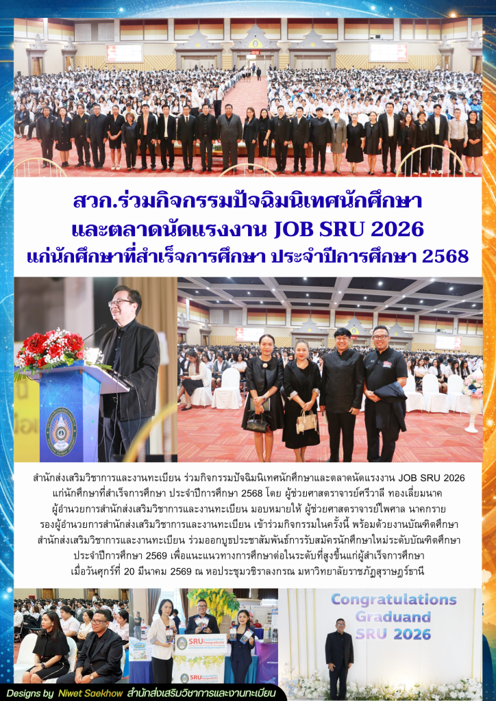 สำนักส่งเสริมวิชาการและงานทะเบียน ร่วมกิจกรรมปัจฉิมนิเทศนักศึกษาและตลาดนัดแรงงาน JOB SRU 2026 แก่นักศึกษาที่สำเร็จการศึกษา ประจำปีการศึกษา 2568 โดย ผู้ช่วยศาสตราจารย์ศรีวาลี ทองเลี่ยมนาค ผู้อำนวยการสำนักส่งเสริมวิชาการและงานทะเบียน มอบหมายให้ ผู้ช่วยศาสตราจารย์ไพศาล นาคกราย รองผู้อำนวยการสำนักส่งเสริมวิชาการและงานทะเบียน เข้าร่วมกิจกรรมในครั้งนี้ พร้อมด้วยงานบัณฑิตศึกษา สำนักส่งเสริมวิชาการและงานทะเบียน ร่วมออกบูธประชาสัมพันธ์การรับสมัครนักศึกษาใหม่ระดับบัณฑิตศึกษา ประจำปีการศึกษา 2569 เพื่อแนะแนวทางการศึกษาต่อในระดับที่สูงขึ้นแก่ผู้สำเร็จการศึกษา เมื่อวันศุกร์ที่ 20 มีนาคม 2569 ณ หอประชุมวชิราลงกรณ มหาวิทยาลัยราชภัฏสุราษฎร์ธานี