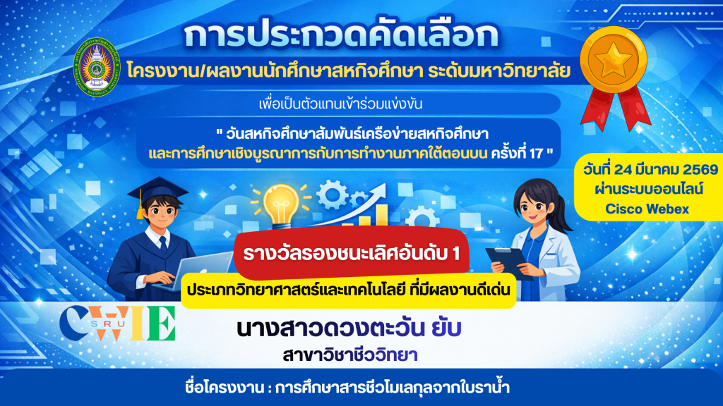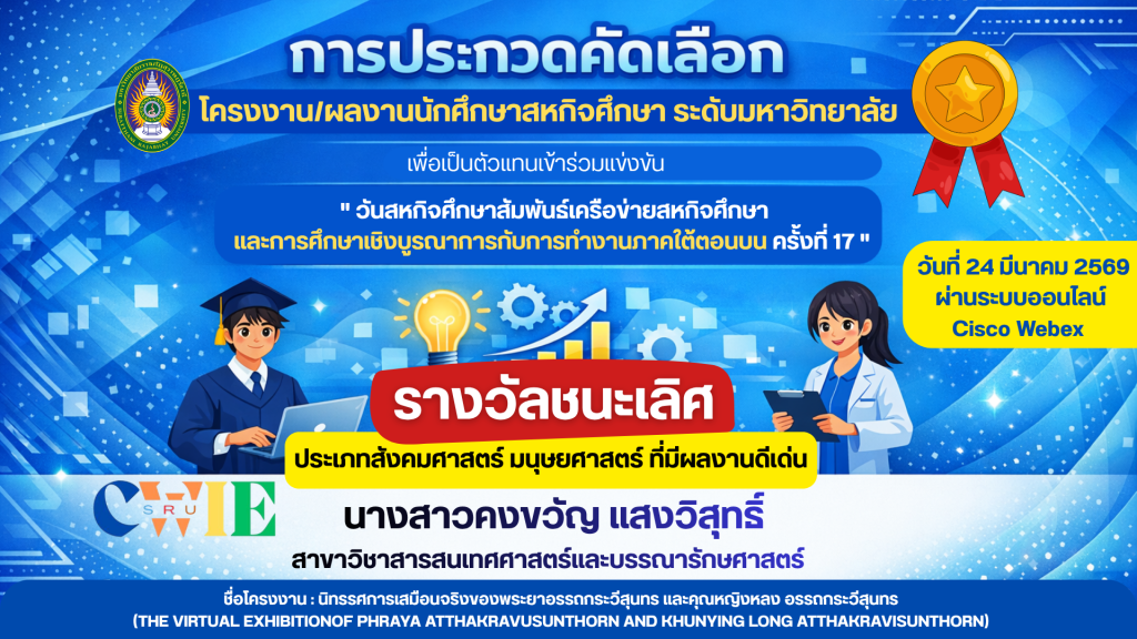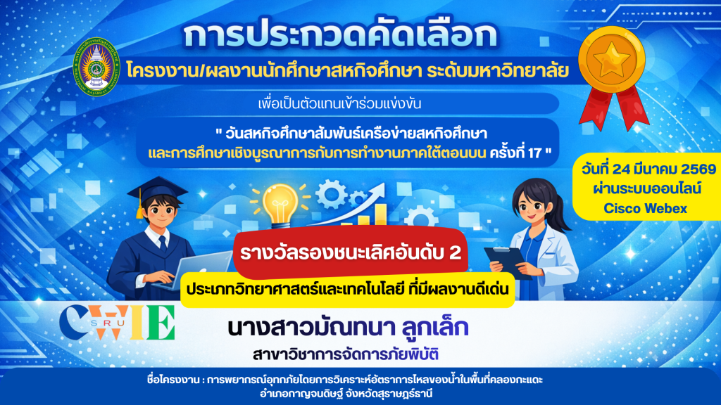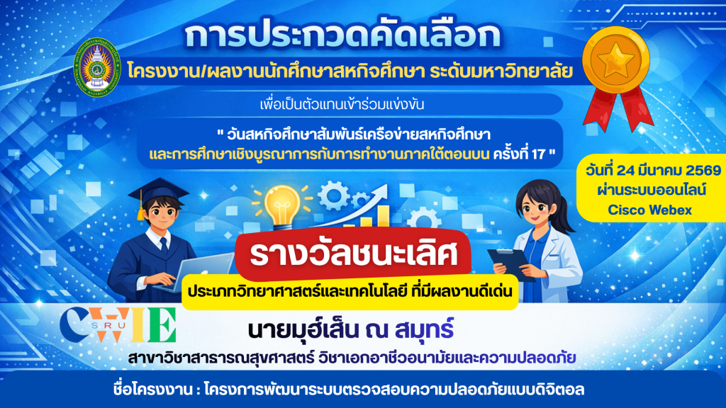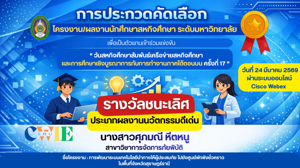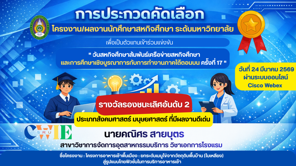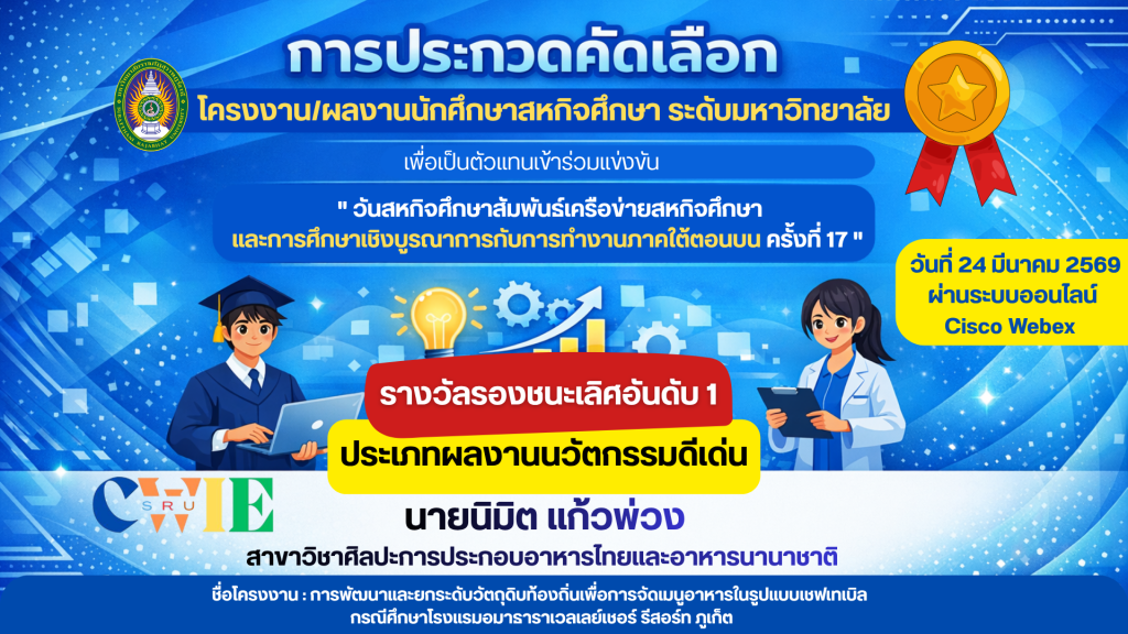 REGIS NEWS การประกวดคัดเลือก โครงงาน/ผลงานนักศึกษาสหกิจศึกษา ระดับมหาวิทยาลัย เพื่อเป็นตัวแทนเข้าร่วมแข่งขัน”วันสหกิจศึกษาสัมพันธ์เครือข่ายสหกิจศึกษาและการศึกษาเชิงบูรณาการกับการทำงานภาคใต้ตอนบน ครั้งที่ 17″เมื่อวันที่ 24 มีนาคม 2569 ผ่านระบบออนไลน์ Cisco Webex