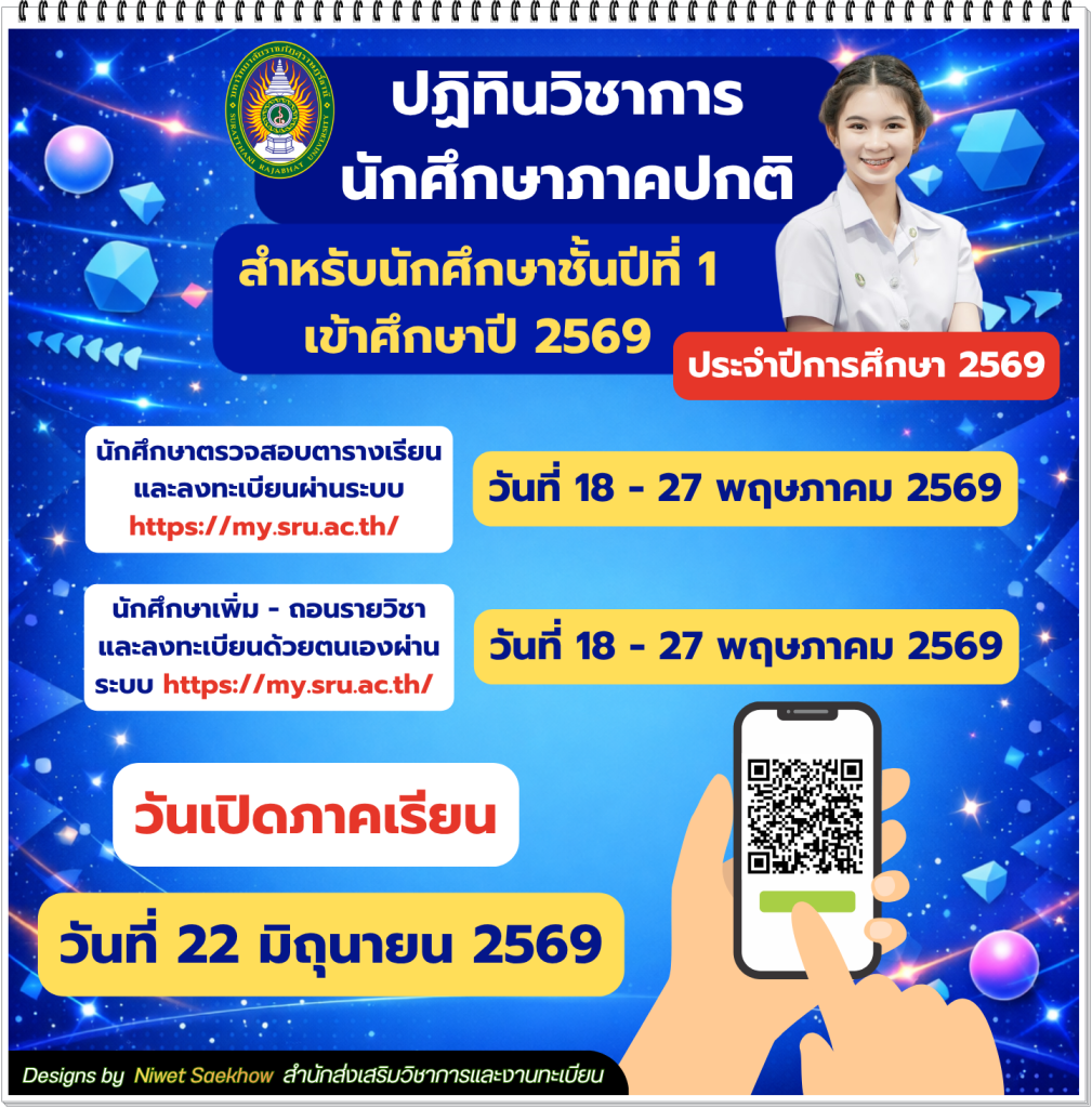 REGIS NEWS ปฏิทินวิชาการนักศึกษาภาคปกติ สำหรับนักศึกษาชั้นปีที่ 1 เข้าศึกษาปี 2569 ประจำปีการศึกษา 2569 16/04/2026 adminreg ข่าวประชาสัมพันธ์, ปฏิทินวิชาการ, ประกาศสำหรับคณาจารย์, ประกาศสำหรับนักศึกษา ปฏิทินวิชาการนักศึกษาภาคปกติ สำหรับนักศึกษาชั้นปีที่ 1 เข้าศึกษาปี 2569 ประจำปีการศึกษา 2569Download Share This Twitter Facebook LinkedIn Email adminreg Related Posts REGIS NEWS เปิดโลกประสบการณ์ระดับนานาชาติ! นักศึกษา มรส. โชว์ศักยภาพปฏิบัติงานสหกิจศึกษา ณ สาธารณรัฐประชาชนจีน สำนักส่งเสริมวิชาการและงานทะเบียน มรส. จัดกิจกรรม การนำเสนอผลการปฏิบัติงานสหกิจศึกษานานาชาติเมื่อวันศุกร์ที่ 17 เมษายน 2569 ณ ห้องประชุมเฟื่องฟ้า 4 ชั้น 4 อาคารสำนักงานอธิการบดี โดยเปิดเวทีให้นักศึกษาได้ถ่ายทอดประสบการณ์จริงจากการไปปฏิบัติงาน ณ… REGIS NEWS ประกาศจาก งานทะเบียน มรส. สำหรับนักศึกษาภาคกศ.บท. ประจำภาคเรียนที่ 1/2568 นักศึกษาทุกชั้นปี เพิ่ม – ถอน รายวิชา เปิดรายวิชาพิเศษ เพิ่มเติม เฉพาะนักศึกษาที่ชำระเงินค่าธรรมเนียมการศึกษาเรียบร้อยแล้ว วันที่ 18 – 26 เม.ย. 69 เท่านั้น REGIS NEWS วันเปิดภาคเรียน นักศึกษาภาคกศ.บท. ประจำภาคเรียนที่ 1/2568 เริ่มจัดการเรียนการสอน วันที่ 18-19 เมษายน 2569